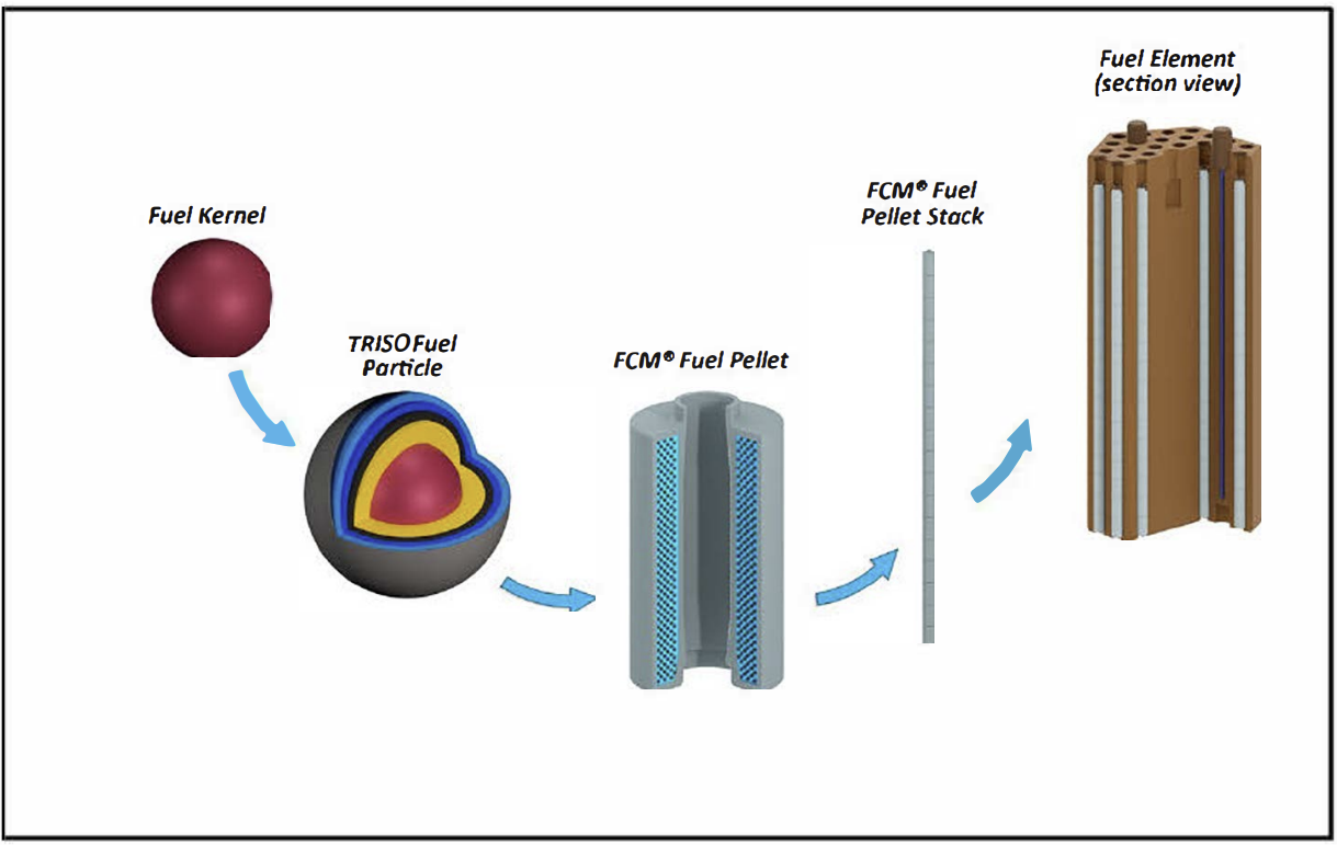 The KRONOS MMR fuel consists of Uranium Oxycarbide (UCO) tristructural isotropic (TRISO) coated particles, which are each no larger than a poppy seed. Uranium Oxycarbide is one of two common fuels used in reactors, and resides in the center of the fuel particle; this is referred to as the kernel. Tristructural isoptriopic (TRISO) is a series of 3 coatings over the kernel that help retain fission products and radionuclides (unstable isotopes of elements that emit radiation as they decay) inside the kernel. The inner and outer coatings are pyrolytic carbon (PyC) with slightly different characteristics between the inner and outer layers, and the inner layer is Silicon Carbide (SiC), which is the most effective barrier to the release of radioactivity from TRISO particles. These TRISO particles are then embedded into an additional cylindrical ceramic matrix to form a Fully Ceramic Micro-encapsulated (FCM) annular fuel pellet. These layers provide Defense-In-Depth and are key to the functional containment. The FCM fuel form is designed to provide excellent fission product retention under normal operating and accident conditions.